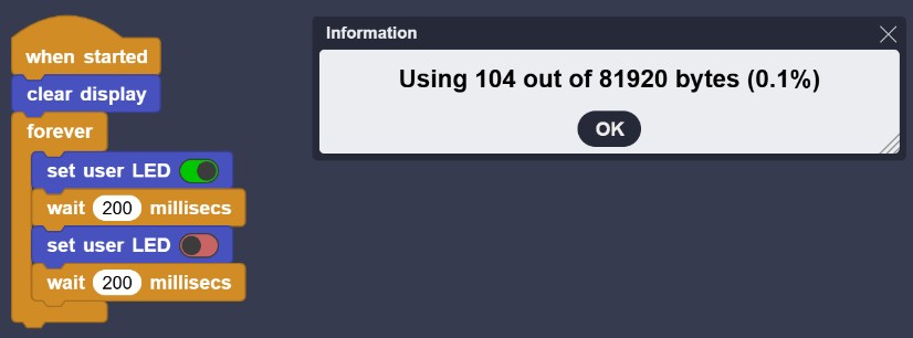 Most important part of this information is the first line, where the number of compiled bytes size is displayed. This information is important, because MicroBlocks scripts have a size limitation due to the limited micro controller memory sizes. Maximum compiled byte size for a script has to be no more than 1000 bytes.